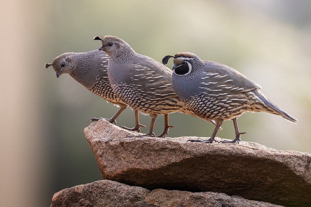 California quail are the state bird of California. They live in the wild along the Pacific coast from Canada to California. The form groups of 30-300 birds. They are small and round gray-brown birds. The plume on their heads is formed by six black feathers. Often, wild California quail get all the water they need from the bugs they eat. This helps them survive in dry environments.